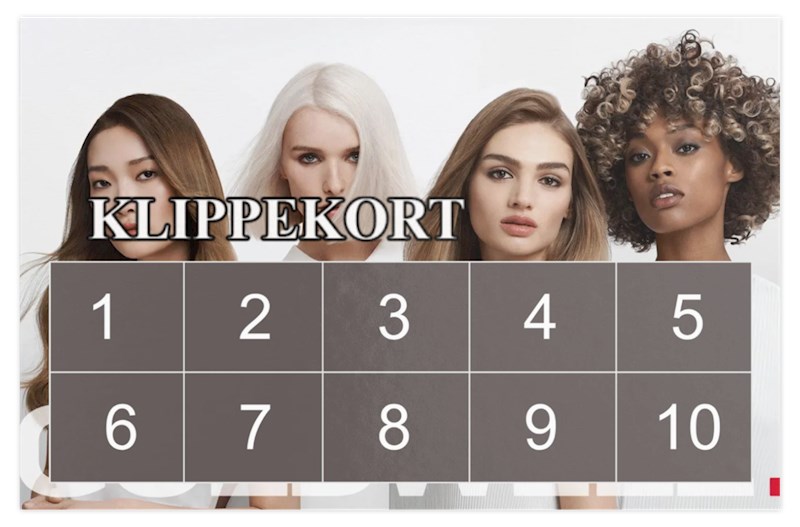 Her betaler du for 9 klipp, og får 1 gratis. I tillegg gir vi 1 liter shampoo gratis (verdi kr. 649,-) Eget klippekort gis deg første gangen. Hele klippekortet må betales ved første time.